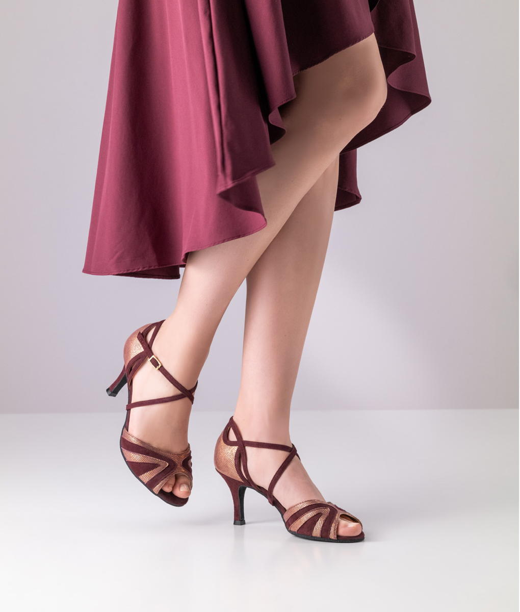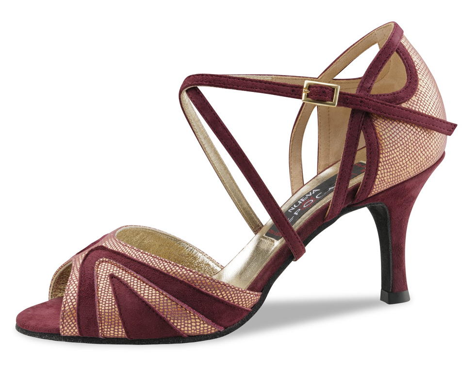Hier ist "Vienna" Entdecken Sie den eleganten Tanzschuh Vienna von Nueva Epoca – ein Meisterwerk an Stil und Funktionalität. Vienna ist aus hochwertigem weinrotem Velourleder in Kombination mit funkelnden Printleder gefertigt. Die feinen Kreuzriemchen und die verstellbare Schnalle bieten eine optimale Passform und sicheren Halt. Lassen Sie sich von der hochwertigen Verarbeitung und dem exquisiten Design verzaubern und machen Sie Vienna zu Ihrem treuen Begleiter auf der Tanzfläche. |